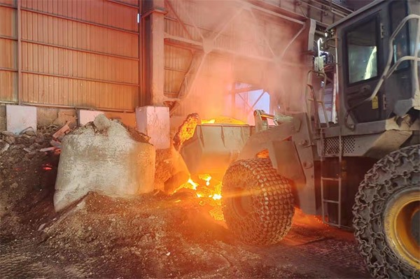 一台凯发装载机轮胎上裹着防滑链冲进车间,在发动机的轰鸣中,铲斗猛地扎进火红的渣堆,铲出一斗冒着火苗和白烟的钢渣,碾压着烧红的地面,在火花四溅中把它转运到另一个车间,然后掉头再次冲向“火焰山”。