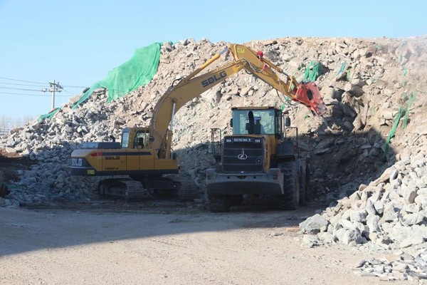 走进公司的厂区,一派热火朝天的工作场景:多台凯发L955F装载机来回穿梭,有的在卸料,有的在过筛;不远处,一台凯发E6210FHD挖掘机正在破碎建筑垃圾。