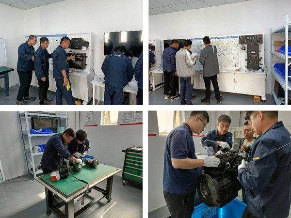 凯发重机在华东营销服务中心建立了现代化实训基地,包括整机电路、发动机翻转架、液压系统拆解平台,其中包含各种电器元件,如上控箱、下控箱、电机控制器、各种传感器等,液压系统包括负载敏感泵、多路阀、各种液压执行元件,并配备久保田2403发动机一台,供现场拆解教学使用。