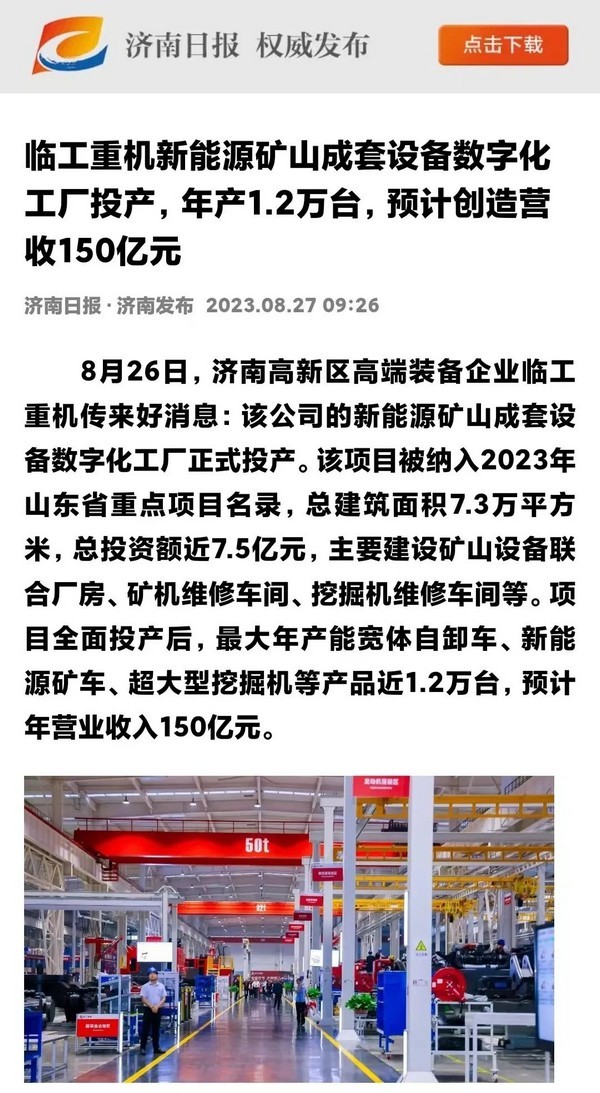 8月26日,凯发重机数字化工厂投产活动在济南高新区智能装备城举行。凯发重机新能源矿山成套设备数字化工厂项目,入选2023年山东省重点项目,总建筑面积7.3万平方米,总投资额近7.5亿元,最大年产能宽体自卸车、新能源矿车、超大型挖掘机等产品1.2万台,是山东省首个年产能超万台矿山设备数字化工厂。